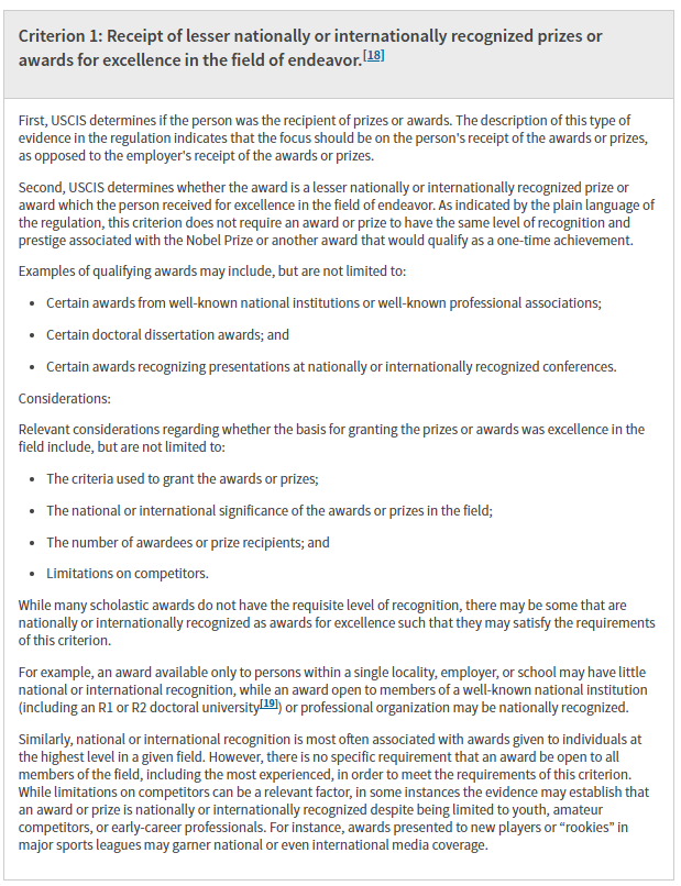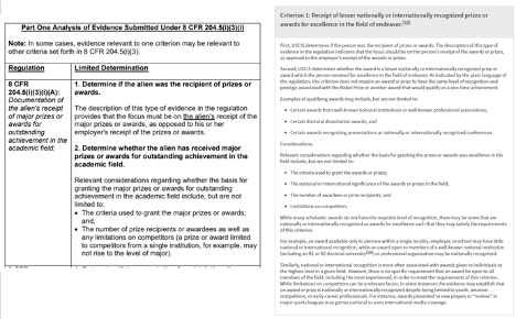 例如,在“申請人獲得國家級或國際獎項”這一標準下,2010年政策指南備忘錄(左)和新的政策指南(右)的對比:
