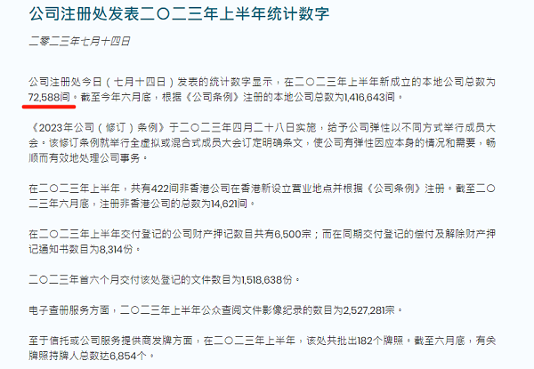 香港公司注冊處統計數字顯示,今年上半年新成立的香港本地公司總數達72,588家,比2022年上半年多可以說平均每天就有400間新公司。